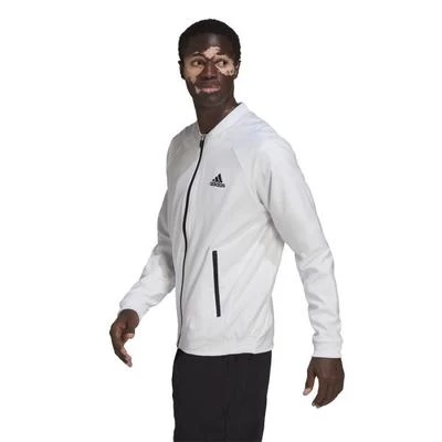 The Adidas White Tennis Jacket allows you to remain fresh and dry, whilst the sweat evaporates. Bring the new jacket to the court in style and compete against your opponents in a cool and calm manner. Colour: White Product Details Ribbed elastic collar Full length zip with neck protection Two side pockets with zip Elastic cuffs and lower hem Adidas Logo Fabric: 100% recycled polyester