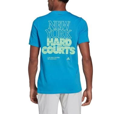 The graphics and typography on this adidas crew neck tee take inspiration from the styles shown in the mid-90s. Easy to wear and made for comfort, the fabric fibers are extremely smooth to the touch. Aeroready technology provides sweat-wicking relief that you’ll need in order to perform your best on the hard courts of New York! Colour: Pulse blue Product Details Aeroready technology Fabric: 70% cotton / 30% recycled polyester