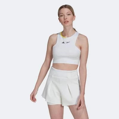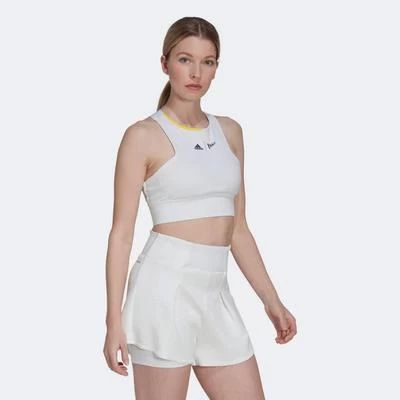 Serve for the oceans in a tennis crop that throws the spotlight on plastic waste. Part of an adidas collection created for the world’s most famous grass court tournament, this slim-fitting top is all about keeping you comfortable on court. Soft to the touch, it comes with mesh lining and moisture-absorbing AEROREADY to further reduce distractions. Laser cut, Morse code-inspired details on the strap tap out a message about the plight of our blue planet. Colour: White / Impact Yellow Product Details Slim fit Round neck Mesh lining Moisture-absorbing AEROREADY X-Back Integrated bra with removable pads Laser cut details on back strap This garment contains a minimum of 40% recycled material in total