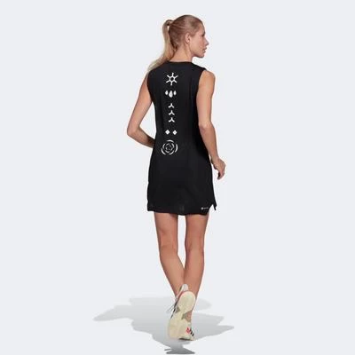 Built so you can be the best. This adidas tennis dress celebrates Paris, in all its diverse glory, and the tough major tournament it hosts. Separate shorts have Alphaskin for an adaptive fit that wraps your body for comfort. Side slits on the dress help movement, while HEAT.RDY keeps you cool no matter how frenetic the action. A bold print nods to exotic plants in the greenhouses that backdrop the on-court battles. Colour: Black / White Product Details Regular fit Crewneck HEAT.RDY Separate tights with adaptive-fit Alphaskin Droptail hem Soft and cool fabric Yarn contains 50% Parley Ocean Plastic Single jersey