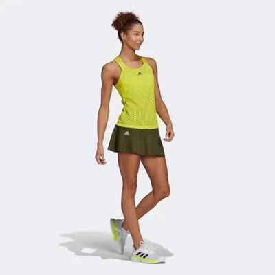 Marking the return of an icon. Showing off subtle graphics that mimic the mighty Barricade’s herringbone outsole, this adidas tennis skirt makes an impression. Aeroknit absorbs moisture to keep you fresh through every point and the wide waistband delivers a snug, locked-in feel. Starring with a slightly flared silhouette, it can be seen gracing the court at North America’s biggest tennis tournament. Colour: Khaki Green From Problem To Performance This product is made with Primeblue, a high-performance recycled material in part with Parley Ocean Plastic. Stay Dry adidas Aeroknit uses adidas AEROREADY materials which absorb moisture from your body to keep you feeling dry as you move. Wide Waistband The wide waistband offers extra coverage and comfort. Worn In NYC adidas athletes wear this skirt at North America’s most prestigious tennis tournament. Product Details Regular fit Wide elastic fit Slightly flared skirt Colourblocked Jacquard Primeblue