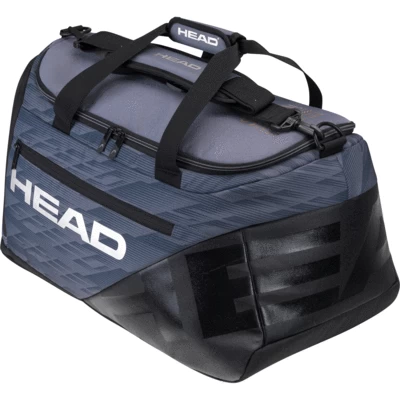 The HEAD Djokovic Duffle Bag offers players a generous amount of space to gather all their important tennis gear together for a day on the court! Colour: Anthracite / Black Product Details Large central zip compartment and internal mesh pocket for smaller personal accessories Side pocket with zip and bag for shoes or dirty clothes Large front pocket for accessories Padded handles with velcro closure Adjustable, padded and removable shoulder strap Handle with soft velcro closure for comfortable carrying by hand Resistant and durable material Head logo printed Dimensions: 54 x 31 x 33 cm