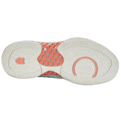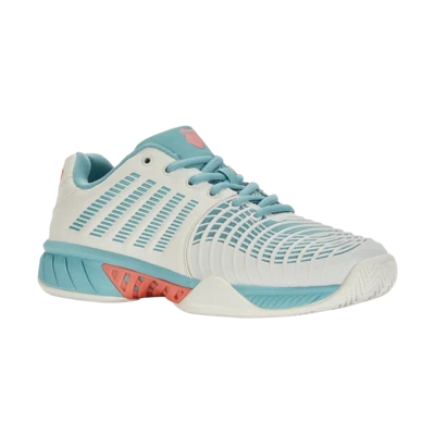 Express Light 3 is a lightweight tennis shoe designed for on-court performance and a great level of comfort. As the updated model of its successful predecessor, the upper features DuraWrap Flex, a newly designed moulded RPU cage that provides flexible support and drag protection. On the inside, a well-padded ankle collar provides comfort and stability while a die-cut foam sock liner adds responsive cushioning underfoot. The Express Light 3’s outsole is made with K-Swiss’ signature Aösta 7.0 high-density rubber and features a deep herringbone tread, creating a tennis shoe specifically designed for unsurpassed durability and performance on all courts. Colour: White / Nile Blue / Desert Flower Product Details Textile collar lining Moulded rubber outsole Aösta 7.0 CMEVA midsole Ortholite sock liner Lace closure