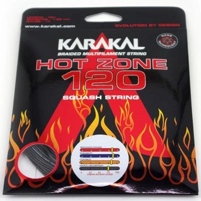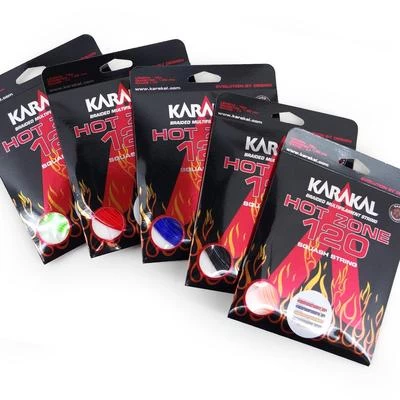 Designed for power and control, this string is perfect for advanced and improving players seeking great balance and ultimate comfort. The Karakal Hot Zone 120 is a braided multifilament squash string that has proven to be hugely popular with more advanced players and improving players alike. The braided high tensile multifilament’s give exceptional power without sacrificing comfort. This power rich string is finished with Nano Elastomer resin which enhances the feel and durability. It is ideally suited to players looking for a powerful string with good balance, comfort and control. High Tensile Multifilament core Powerful Braided Multifilament layer Durable Nano Elastomer coating 1.20mm Diameter 10m set Available in 5 colours – blue, green, black, orange and red.