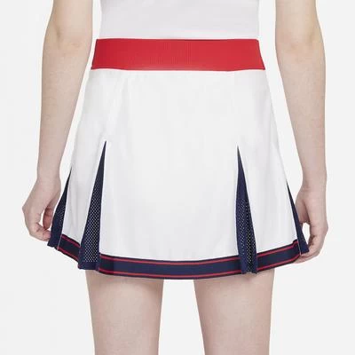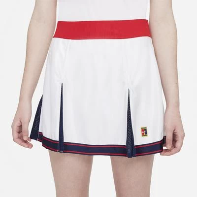 The Centre Court gets a retro throwback in the NikeCourt Dri-FIT Slam Skirt, with its subtle sheen and colour-blocked mesh pleats, the flowy design embraces the rebel vibe of the 80’s tennis. Colour: White / University Red / Binary Blue Pleated Performance Mesh pleats help keep you cool while adding volume as you run on the court. Dry Design Nike Dri-FIT Technology moves sweat away from your skin for quicker evaporation, helping you to stay dry and comfortable. The knit fabric has a subtle sheen and contrast striping that’s inspired by classic court apparel. Comfortable Waistband The wide waistband is made from ribbed fabric for extra stretch and breathability in this high-heat and high-motion area. Product Details Inner shorts let you tuck spare balls under the hem for convenient storage Multi-coloured NikeCourt patch nods to Nike’s heritage Standard fit for a relaxed, easy feel