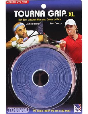 The Tournagrip Original XL OverGrips comes in a economy pack of 10 grips. This means you can wrap up multiple rackets or have various spares at your disposal. A super absorbent which is also extra long, perfect for longer handles. Used by professionals such as Pete Sampras and the Bryan twins. So you get professional level quality. XL length to fit long handles Tournagrip overgrips in classic blue colour Super absorbent dry feel Best grips you can get for hot and humid conditions As endorsed and used by Pete Sampras and the Bryan twins Pack of 10 Economy Pack